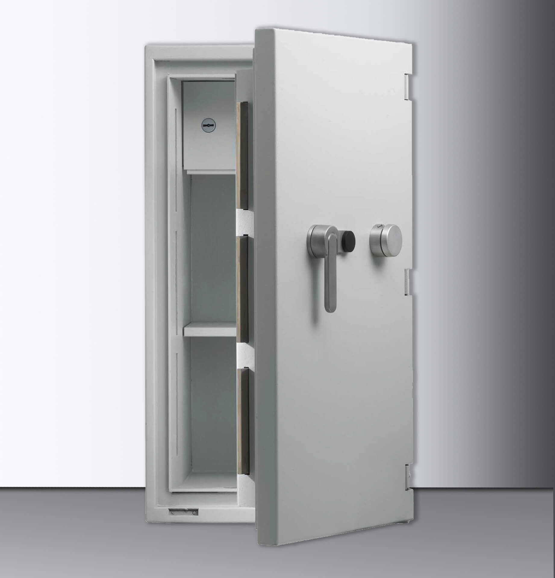 So sicher wie ein Tresor nur sein kann: Der Aufbau von Korpus und Tür besteht aus mehrwandigem Stahl und einer Füllung aus Spezialbeton. Der zusätzlich gepanzerte Verschlussbereich, zwei Schlössern und der Verriegelung mit massiven Stahlflachriegeln sichern den Türbereich.